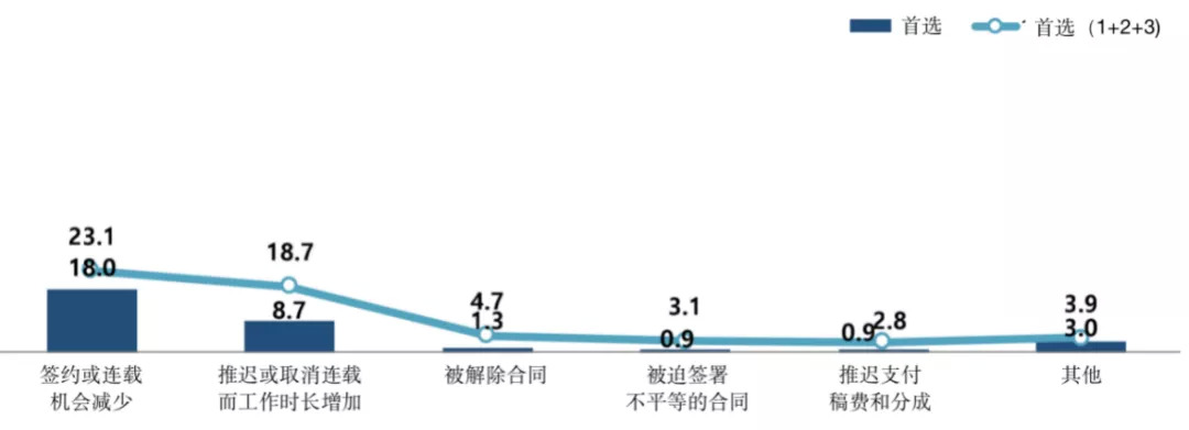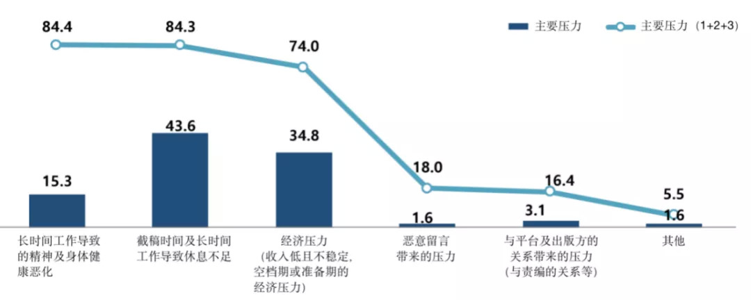 这样高强度的工作日常不可避免地让许多作者感到有压力,而这其中43.6%的作者表示每天都会因截稿日期和长时间的工作而没有休息时间承受着巨大的压力。而另一个压力来源也与工作时长有关,即长时间工作带来的身体及精神健康的恶化。