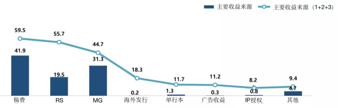 网漫作者的收入来源也并非只有稿费,还有RS(付费分成)、MG(保底收入)、海外发行、单行本销售、广告收益、IP授权、其他等。据调查发现,41.9%的作者收益主要还是来自稿费,31.3%的作者收益来自保底收入,19.5%的作者收入主要来自平台付费机制带来的分成收益,而只有0.8%的头部作者主要收益来自IP授权。