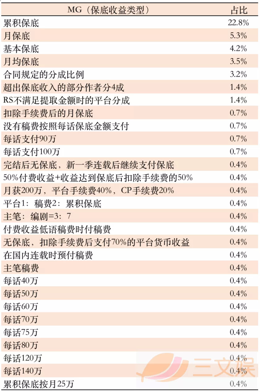 与平台签约后的保底收益方面,累积保底收益占比最高达到22.8%,其次是月保底收益5.3%、基本保底收益4.2%、月均保底收益3.5%、合同规定的每话的分成收益3.2%。