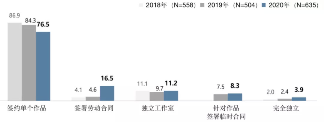 在签约方面,76.5%的作者是以签约单个作品的方式与平台签约,16.5%的作者则是通过与平台或出品方直接签约劳动合同,11.2%的作者是以独立工作室的方式创作,8.3%的作者以单个作品签约临时合同,3.9%的作者则完全独立。