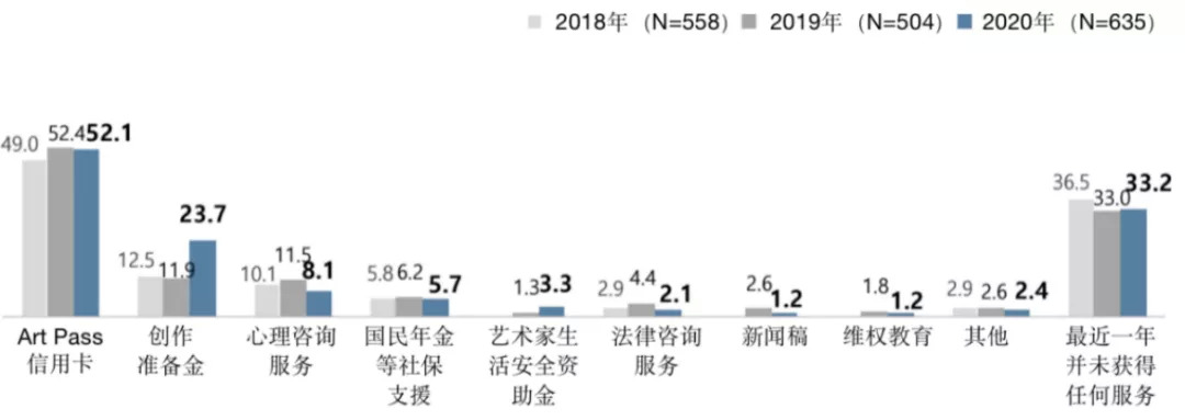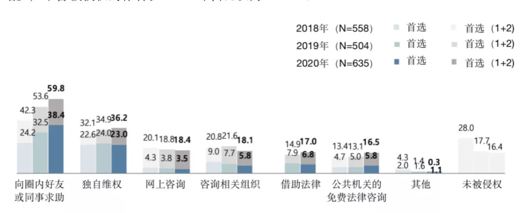 在作者的相关权益受到侵害时,38.4%的作者会向圈内朋友或同事寻求帮助,23%的作者选择独自维权,6.8%的作者选择借助法律,5.8%的作者会向相关的组织咨询,5.8%的作者会借助公共组织的免费法律咨询服务。相应的曾被侵权或正在经历侵权事宜的作者在逐年增多,未曾被侵权的作者在2020年占比仅为16.4%。