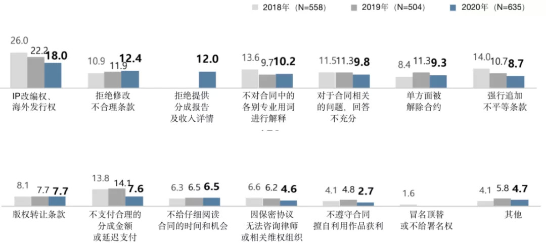 在合同签约时,有不少作者曾签署过相对不平等的合同,其中18%的作者在签署海外发行权、IP改编权时被迫签署不利于作者本身的合同,12.4%的作者曾要求修改合同内容却遭到了拒绝,12%的作者则被拒绝提供分成报告及收入详情。