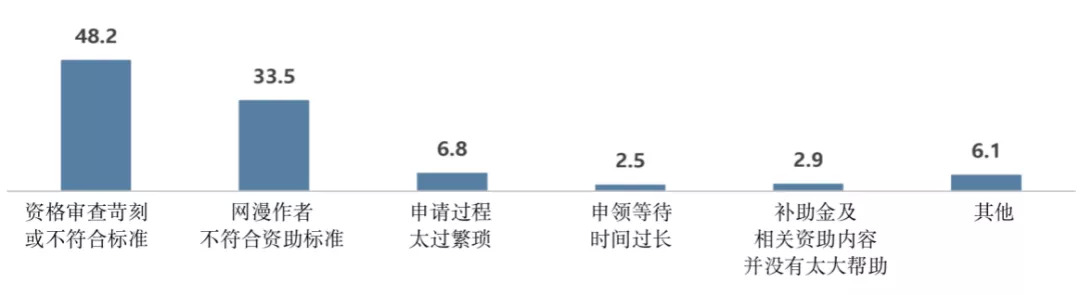 而对于278位没有获得安全创作补助金的原因,48.2%的作者是因为资格审查苛刻或不符合标准,33.5%是因为网漫作者不符合资助标准,6.8%的作者是因为申请过程太过繁琐。