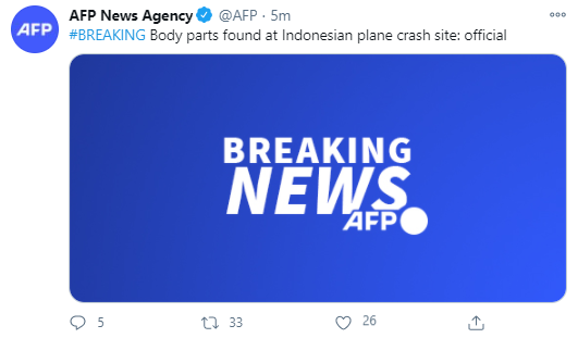 法新社1月10日消息,官员表示,印尼客机失事现场发现人体遗骸。