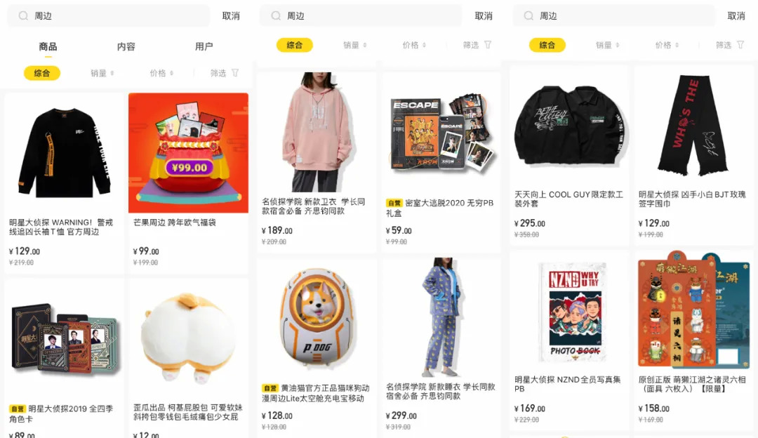 除此之外,芒果TV的独家热门内容《明星大侦探》《密室大逃脱》《天天向上》等芒果TV的长视频内容衍生而出的周边,各路明星的官方周边和明星同款类等商品已经上线。此外,还有Tokidoki和变色龙等知名潮玩品牌入驻。