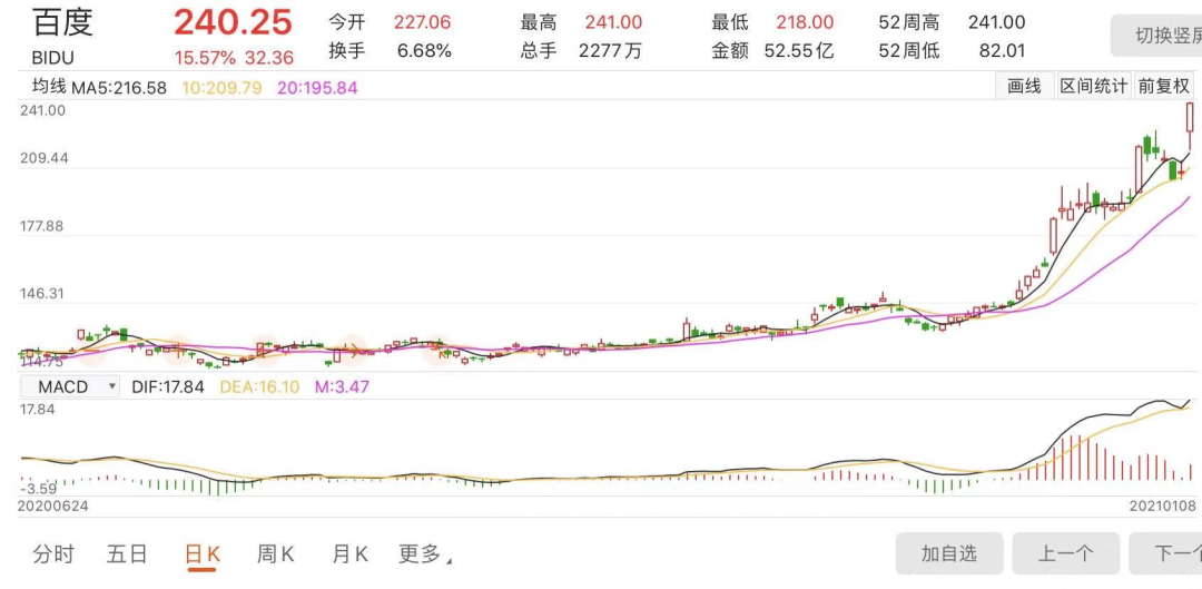 1月8日,百度股价暴涨15.57%,市值达到819亿美元(约5306亿人民币),创2018年8月以来新高。一夜之间,百度市值飙升了110.亿美元(约715亿人民币)。