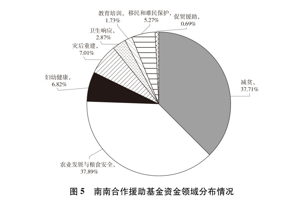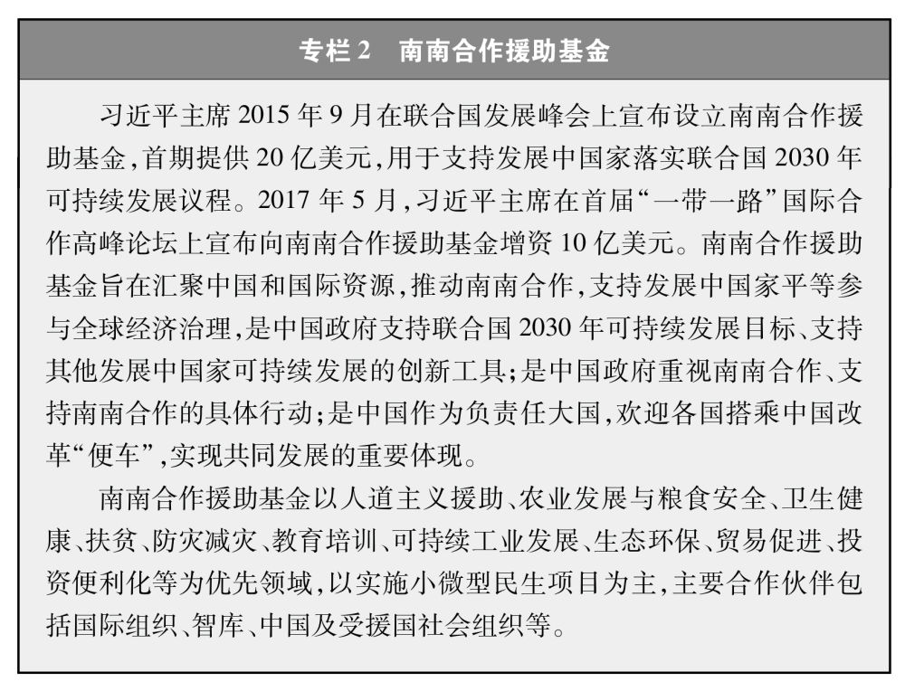 ——南南合作援助基金。截至2019年底,中国与联合国开发计划署、世界粮食计划署、世界卫生组织、联合国儿童基金会、联合国人口基金、联合国难民署、国际移民组织、国际红十字会等14个国际组织实施项目82个,涉及农业发展与粮食安全、减贫、妇幼健康、卫生响应、教育培训、灾后重建、移民和难民保护、促贸援助等领域。