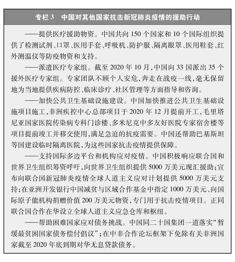 ——继续为广大发展中国家抗疫提供力所能及的支持。为各方提供医疗物资援助,开展医疗技术合作,派遣医疗专家组。在两年内提供20亿美元国际援助,支持受疫情影响的国家特别是发展中国家抗疫斗争以及经济社会恢复发展。继续毫无保留地同世界卫生组织和国际社会加强信息共享和经验交流,开展检测方法、临床救治、疫苗药物研发国际合作,尽快全面遏制新冠肺炎疫情在全球蔓延态势,维护全球公共卫生安全。