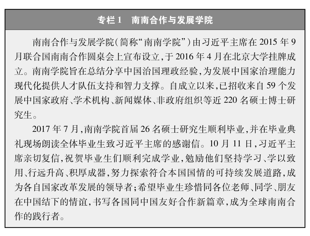 ——发展高等教育。中国积极帮助有关国家改善高等教育设施、培育高素质人才,援建了瓦努阿图南太平洋大学埃马路斯分校、马拉维科技大学、阿富汗喀布尔大学中文系教学楼、坦桑尼亚达累斯萨拉姆大学图书馆、马里巴马科大学卡巴拉教学区等项目。在肯尼亚肯雅塔农业科技大学中援建的中非联合研究中心,开设生物多样性保护与利用、资源遥感等专业,帮助提升相应领域的科技水平。继续提供在职学历学位教育,2013年以来,共资助4300余名发展中国家人员来华攻读硕士博士学位,并通过开展中非高校间“20+20”合作计划、设立“原子能奖学金”项目等加强科研合作和师生互访,联合培养高水平人才。