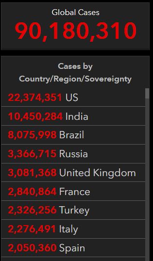 据约翰斯·霍普金斯大学的疫情追踪数据,截至北京时间1月11日8点,全球累计确诊新冠肺炎病例90180310例,累计死亡1932948例。