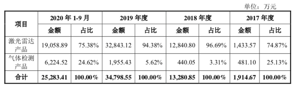 而禾赛科技的营收同样是靠激光雷达所支撑。招股书显示,2017年、2018年、2019年、2020年前九个月,禾赛科技激光雷达产品的营收分别为1433万元、1.28亿元、3.28亿元、1.9亿元,在总营收中的占比则分别为74.87%、96.69%、94.38%、75.38%。