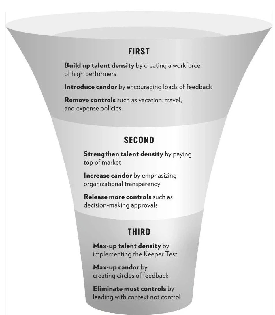 只有保证每个岗位上都是高绩效、有责任感的人才(高人才密度),管理层才能放心解锁权限、取消繁琐制度(低管控度),所有人才能敢于坦诚指出各自问题(高坦诚度)。