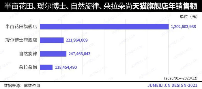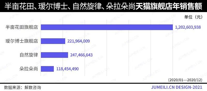 从半亩花田到自然旋律,海洋之风到瑷尔博士,每个济南系品牌都独具特色。我们调取了解数咨询的数据,据不完全统计,仅天猫旗舰店的销量,2020年度济南系就有不少品牌超过2亿元。