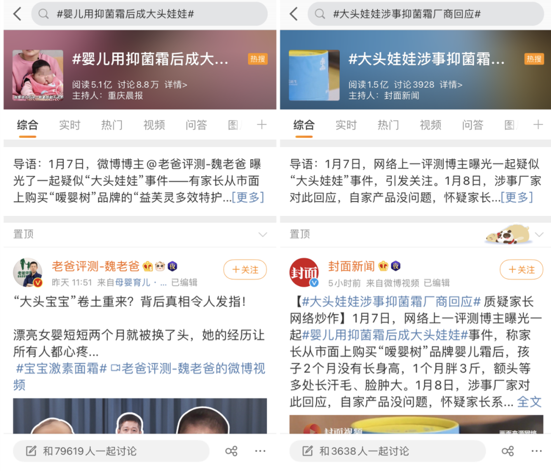 截至发稿,#婴儿用抑菌霜后成大头娃娃##漳洲调查婴儿用抑菌霜后成大头娃娃##大头娃娃涉事抑菌霜厂商回应#等话题相继登上热搜榜,相关话题阅读总量已超7亿。多位网友在评论事件时表示:“黑心商家太可恨!一定要严惩!”