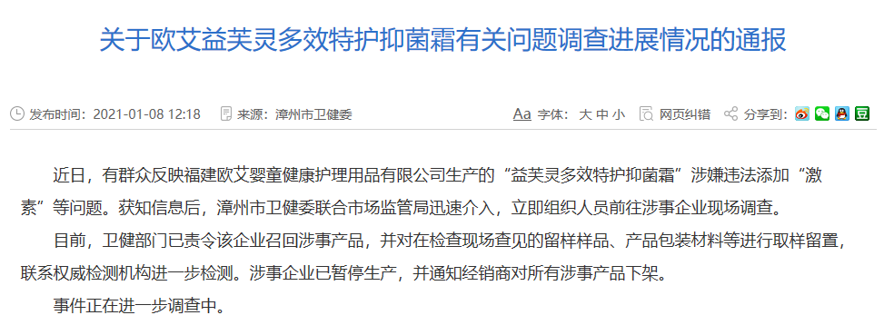 值得注意的是,福建欧艾曾在官方渠道公示过检测报告。据公开报道,2019年5月7日,福建欧艾婴童健康护理用品公司曾在其官方微信号上公布过一份“权威检测报告”,报告显示“欧艾牌抑菌霜”、“益芙灵多效特护抑菌霜”检测结果正常,并称“嗳婴树产品不含激素、抗生素”。不过,目前在福建欧艾官方微信号上,相关消息已清空。