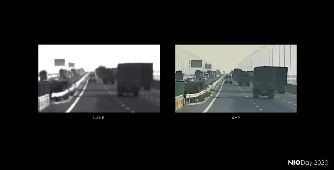 李斌不掩饰ET7在这方面的优势,还用了来两张对比图直观区别,“800万像素的自动驾驶摄像头,可以检测到680多米外的车辆,220多米外的行人,和260多米外的锥桶,能够探测的最远距离,是120万像素的3倍。在实际应用场景中,感知距离更远,感知内容更加精细。”