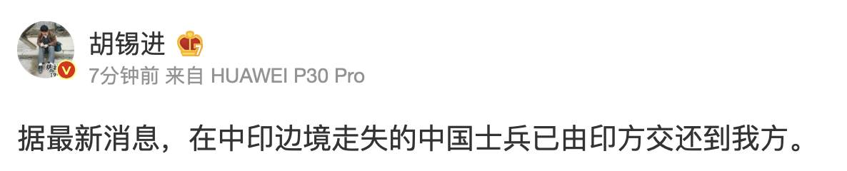 1月11日,《环球时报》总编辑胡锡进通过其个人微博发布消息称,据最新消息,在中印边境走失的中国士兵已由印方交还到我方。