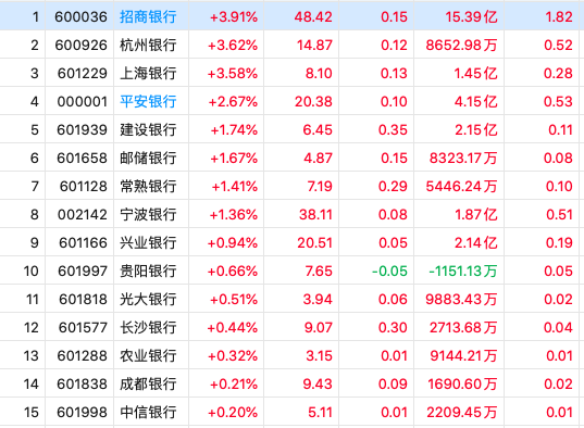 值得一提的是,银行板块表现强劲,护盘有功。当日共有15只银行股上涨,8只银行股上涨幅度超过1%。其中,招商银行(600036.SH)涨幅最大,达到3.91%,总市值达到了1.22万亿元,盘中最高至48.5元刷新历史新高。这也已经是招行股价连续第四天上涨。