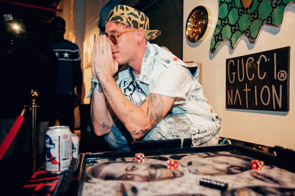 之所以叫他 GucciGhost,是因为 Andrew 极度迷恋 Gucci 的双G标识。这是为什么呢?有可能是因为在他天天踩在滑板上的青少年时期,他买了人生中第一块 Gucci 表。又或者是在某年的万圣节,Andrew 把一副Gucci床单挖了两个洞,然后披在头上去曼哈顿街区逛了逛,他冲着巡逻队大喊:“Gucci 鬼来了!” 总之在那以后,他的名号 GucciGhost 诞生。