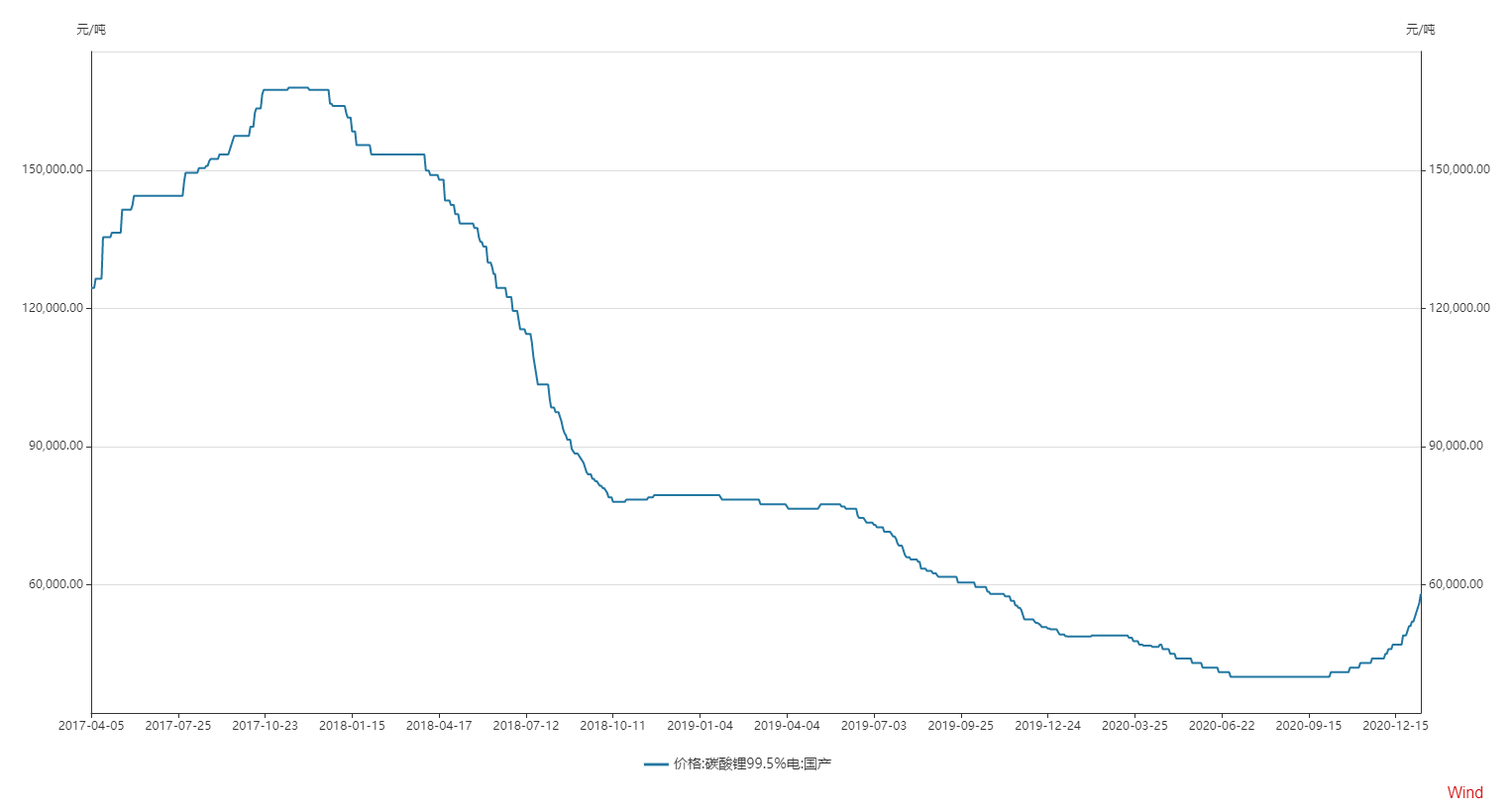 数据显示,2020年下半年以来,锂价已呈现触底反弹趋势。截至2021年1月8日,碳酸锂(99.5%电池级/国产)价格为5.8万元/吨,相较2020年低点的4万元/吨已上涨45%。