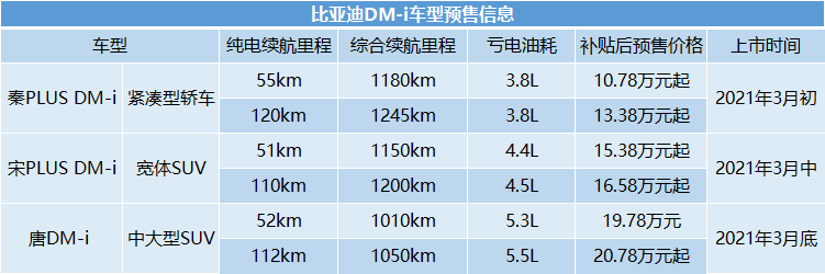 比亚迪发布三款搭载DM-i超级混动技术新车。其中,秦PLUS DM-i定位为紧凑型轿车,纯电续航分为55KM和120KM两款,实现百公里3.8升的亏电油耗,综合续航里程分别为1180公里和1245公里,起售价为10.78万元起;宋PLUS DM-i定位为宽体SUV,纯电续航分为51KM和110KM两款,实现百公里4.4升和4.5升的亏电油耗,综合续航里程达到1150公里和1200公里,起售价为15.38万元起;唐DM-i 定位为中大型7座SUV,纯电续航分为52KM和112KM两款,实现百公里5.3升和5.5升的亏电油耗,综合续航里程达到1010公里和1050公里,起售价为19.78万元起。三款车型均在3月份上市。(财联社记者 刘阳、徐昊)