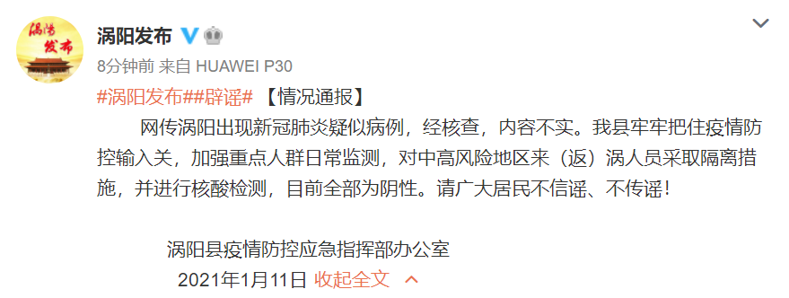 据@涡阳发布 微博1月11日消息,网传涡阳出现新冠肺炎疑似病例,经核查,内容不实。涡阳县牢牢把住疫情防控输入关,加强重点人群日常监测,对中高风险地区来(返)涡人员采取隔离措施,并进行核酸检测,目前全部为阴性。