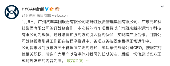 1月11日晚,广汽蔚来新能源汽车科技有限公司在官方微博@HYCAN合创 发布声明称,1月5日,广州汽车集团股份有限公司与珠江投资管理集团有限公司、广东元知科技集团有限公司签订战略合作。本次智能汽车项目将以广汽蔚来新能源汽车科技有限公司为载体,通过增资扩股的方式引入新的伙伴,实现跨产业合作。目前公司战略投资引进工作正在按程序推进中,各项业务按既定目标正常运作中。