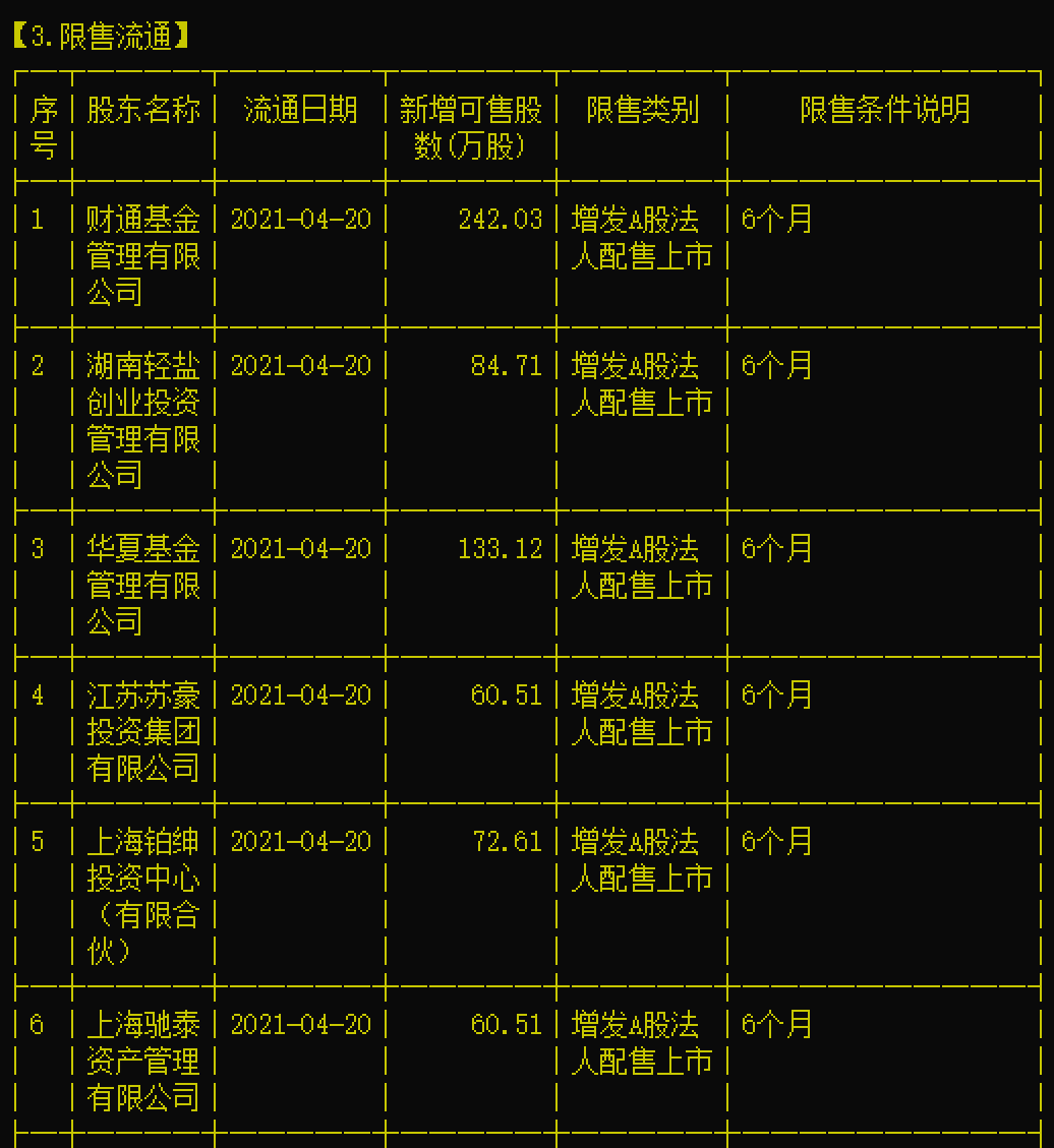 界面新闻记者梳理发现,沃特股份系A股中最先高举高送转大旗的公司,之所以如此高调,或还在于让市场都“看过来”。据悉,2021年4月20日,沃特股份将有一大群限售股获得解禁流通。其中,财通基金管理有限公司有242.03万股,湖南轻盐创业投资管理有限公司有84.71万股,华夏基金管理有限公司有133.12万股,江苏苏豪投资集团有限公司有60.51万股,上海铂绅投资中心(有限合伙)有72.61万股,上海驰泰资产管理有限公司有60.51万股,上海六禾投资管理中心(有限合伙)有60.51万股,上海宁泉资产管理有限公司有161.36万股,深圳嘉石大岩资本管理有限公司有60.51万股,太平洋证券、银河证券、中信建投分别有60.51万股,自然人吴凡有125.05万股,自然人于海恒有121.02万股,自然人邹志红有80.68万股。另外,2021年6月26日还将有35.7万股的股权激励限制流通的股票将获得流通。如此算来,近月内即将流通的股份接近1480万股,相当于目前流通盘的17%左右。