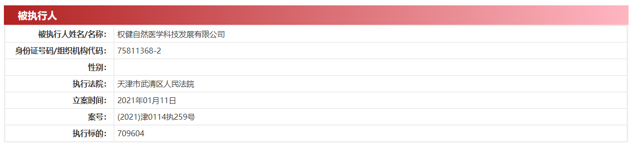 中国执行信息公开网消息,1月11日,权健自然医学科技发展有限公司新增1条被执行人信息,执行法院为天津市武清区人民法院,案号为(2021)津0114执259号,执行标的超70万。