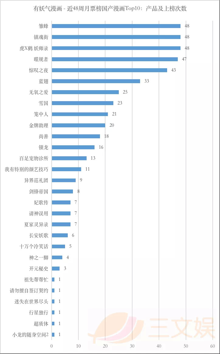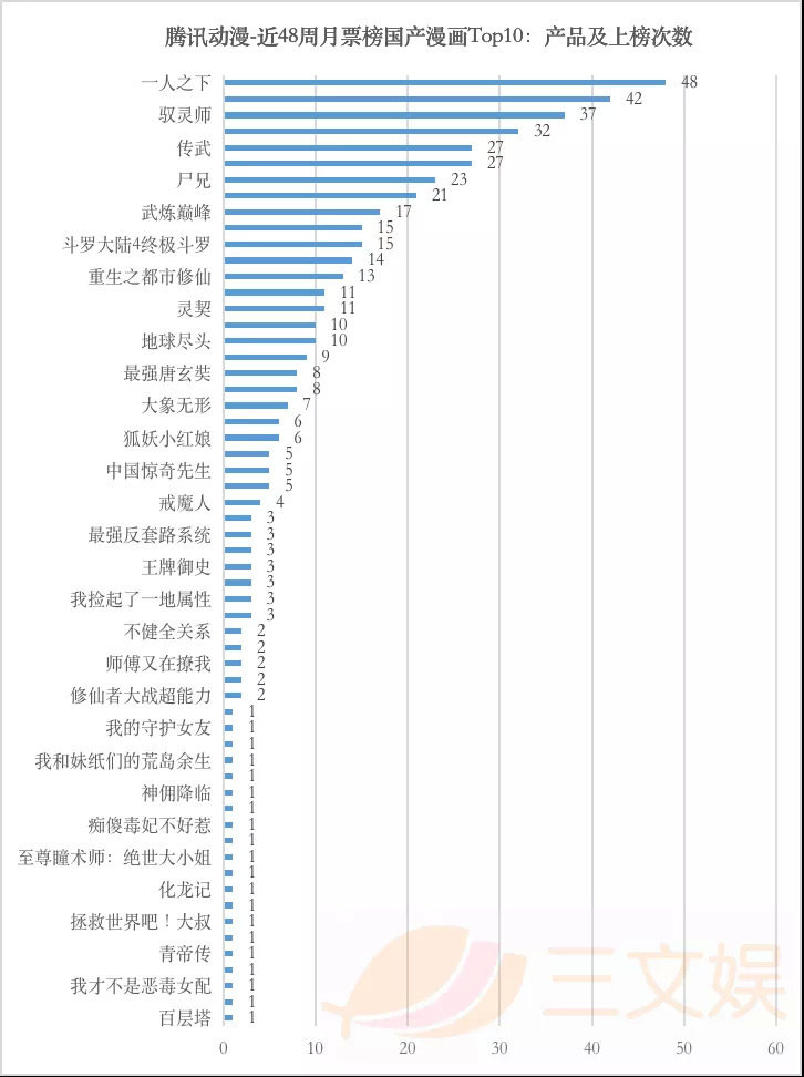 根据2020年发布的48期周刊,三文娱统计了腾讯动漫、快看漫画、哔哩哔哩漫画及有妖气漫画四大平台,在2020年48周的月票榜/畅销榜/精品榜Top10国产漫画作品及上榜次数。