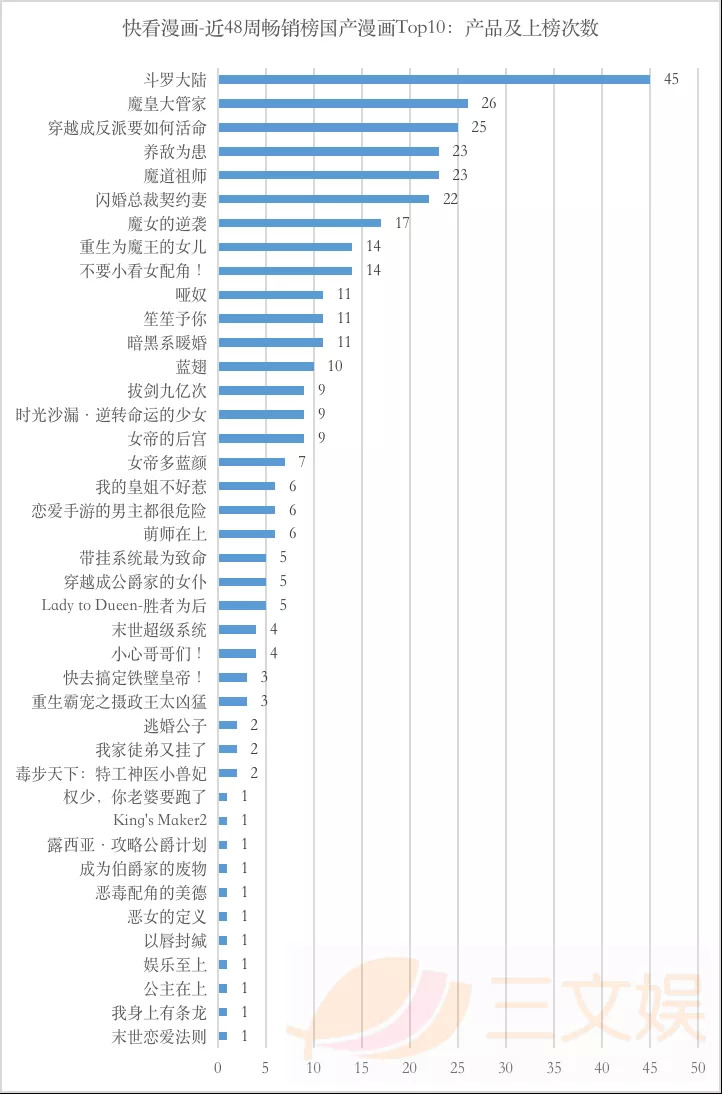 在三文娱根据快看漫画48周月票榜导出的图表中,上榜作品的题材差异较大,但内容方面却有一些共同的特征: