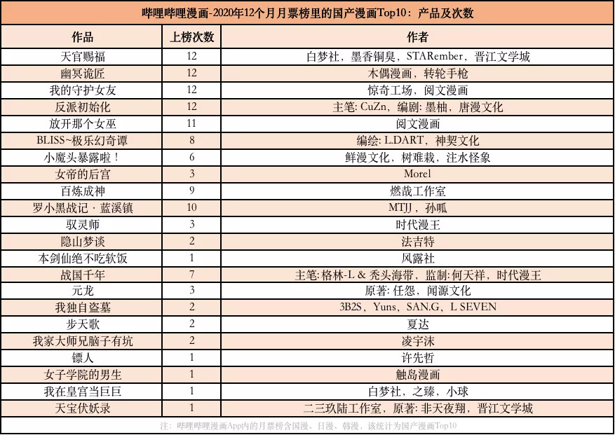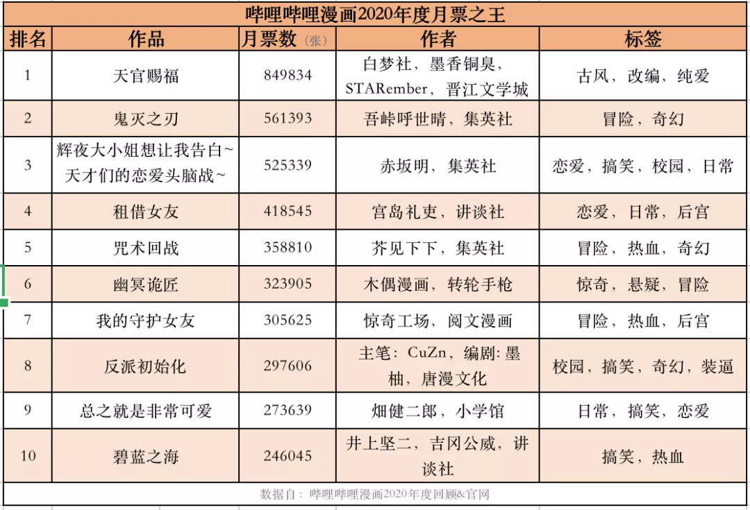 哔哩哔哩漫画的月票榜是总榜,既有国漫也有日韩漫画,但月票榜Top30里有1/3是国漫。且2020年年度月票榜和粉丝投喂榜榜首的作品是《天官赐福》,同期居于年度月票Top10的国漫还有《幽冥诡匠》《我的守护女友》《反派初始化》。