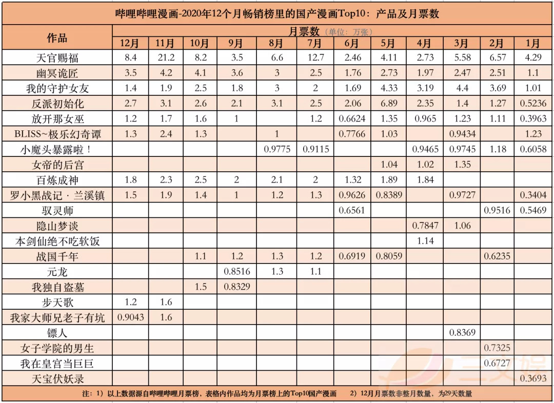 到2020年,三文娱把哔哩哔哩漫画纳入周刊“国产漫画月票榜”统计的时候,惊奇地发现,国产漫画月票榜Top10的作品,几乎都位列月票榜Top30。