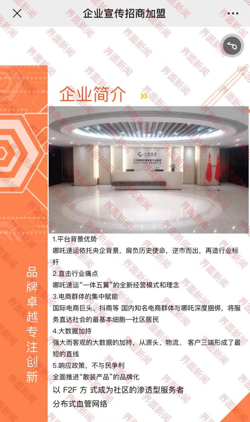 界面新闻获得的一份显示来自该企业的宣传招商加盟资料显示,哪吒速运有限公司成立于2020年11月24日,是江苏国信华夏信息产业集团的全资子公司。而江苏国信华夏的母公司是国家发改委直属国家级事业单位国家信息中心的全资公司——中国国信信息总公司。