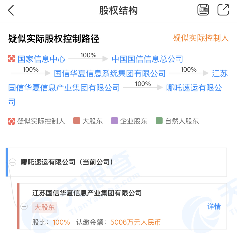 记者查询天眼查APP,疑似实际股权控制路径也佐证了上述信息。资料显示,哪吒速运注册资本5006万元,法定代表人李涵同时也是江苏国信华夏信息产业集团的法定代表人、执行董事、总经理。