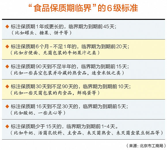 回过头来看中国,早在2012年,北京工商局也曾出台过“食品保质期临界”的6级标准,明确了离保质期多久的食品算临期。