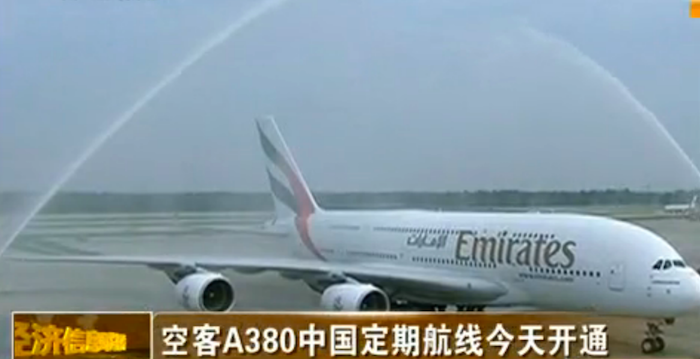 自从2010年北京往返迪拜的直飞航线上正式采用A380飞机运营后,2011年和2016年,阿联酋航空相继在上海和广州的航线上也启用了这个空中巨无霸客机执飞。由此,北京、上海、广州、香港和台北五条航线都迎来了A380的身影。