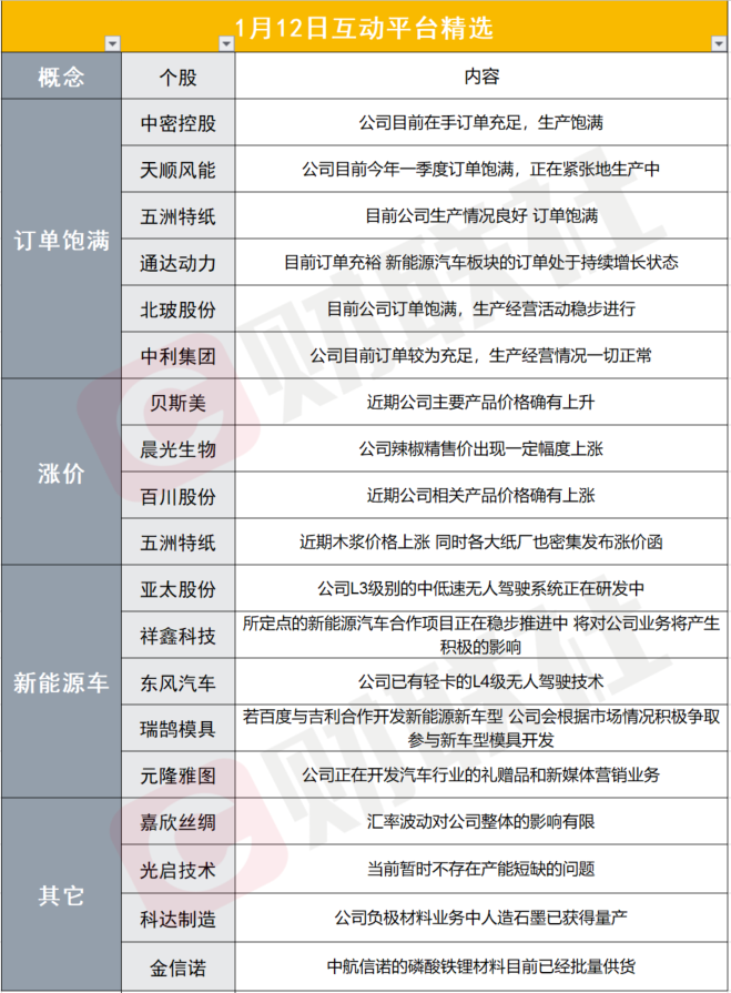 今日市场缩量大涨,三大指数均反包昨日阴线。板块上,军工股掀涨停,白酒、锂电、光伏等板块内多只个股反包,券商股午后爆发,造纸、钛白粉、医药、面板等板块轮动拉升。互动平台上订单饱满、涨价受关注,天顺风能表示公司目前今年一季度订单饱满,正在紧张地生产中;通达动力表示目前订单充裕 新能源汽车板块的订单处于持续增长状态;晨光生物表示公司辣椒精售价出现一定幅度上涨;五洲特纸表示近期木浆价格上涨,同时各大纸厂也密集发布涨价函;瑞鹄模具表示若百度与吉利合作开发新能源新车型,公司会根据市场情况积极争取参与新车型模具开发;光启技术表示当前暂时不存在产能短缺的问题。