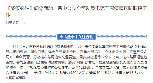 1月12日,晋中公安微信公众号消息,1月11日,市委启动联防联控应急机制后,晋中市公安局认真贯彻落实市疫情防控工作领导小组的要求,闻令而动,连夜召开紧急会议,召集市局机关、介休市公安局、平遥县公安局100余名民警,分赴榆次与周边各交通要道,同步启动运行12个来(离)榆次路面通道检查站。会同卫健部门全面启动战时机制,落实“网格化”管理、检查站查控以及河北入晋人员落地核查工作,严格落实疫情防控各项措施。截至12日8时,全市共启动入省(市)疫情防控联合检查站(卡口、卡点)94个,出动警力3204人次,警车1044辆次,检查人员18.8万人、车辆7.4万辆。
