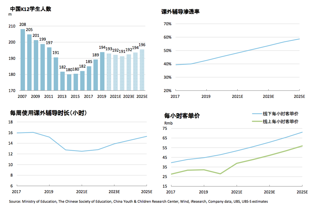 这一市场的增长空间主要是靠持续提升的课外辅导参培率以及客单价的稳步提高拉动的。瑞银证券预计,课外辅导的参培率将由2020年的45%增长到2025年的59%。从2017年到2025年,预计每小时客单价(包括线上、线下)将增长近一倍。