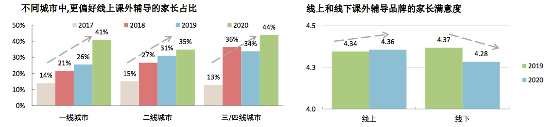 尤其是疫情之后,中国家长对于在线的需求有了明显的改善。上述报告显示,2020年家长的在线偏好度增长10%,这是自2018年以来最大的提升。其中,一线城市增幅最快逾15%,其后是三/四线城市增幅逾10%,二线城市改善最慢,增幅逾4%。