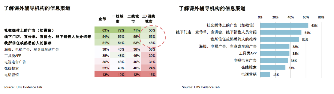 其原因有二,从获课端上看,相较于一二线城市的家长,三四线城市的家长更少依赖社交媒体上的广告获取课外辅导相关信息。对于三四线城市而言,社交媒体广告也并非唯一有效的获客途径。从内容端上看,目前在线大班课内容在低线城市也存在一些局限性。