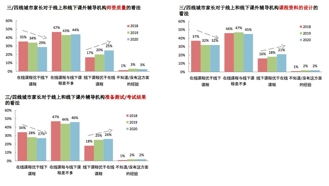 这也导致在三四线城市,在线课外辅导的师资质量和课程内容的竞争力有所下降。报告显示,在师资质量上,三四线城市家长对于在线课程优于线下课程的选择比例,由2018年的35%下滑至2020年的29%。在课程资料的设计上,由2018年的37%下滑至2020年的32%。