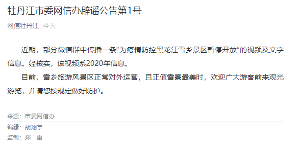 1月12日,“网信牡丹江”微信公众号消息,近期,部分微信群中传播一条“为疫情防控黑龙江雪乡景区暂停开放”的视频及文字信息。经核实,该视频系2020年信息。