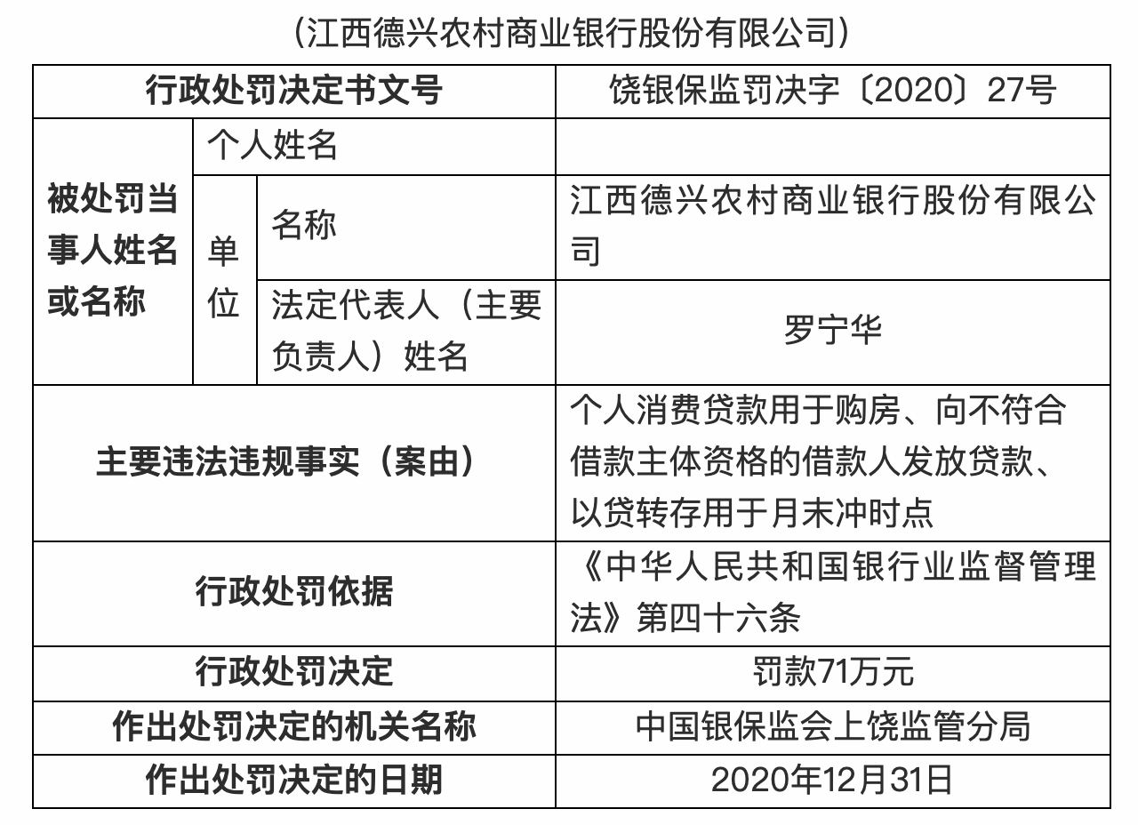 1月12日晚,中国银保监会上饶监管分局发布的行政处罚信息公开表显示,江西德兴农村商业银行股份有限公司因个人消费贷款用于购房、向不符合借款主体资格的借款人发放贷款、以贷转存用于月末冲时点,被处罚款71万元。王宝英对江西德兴农村商业银行股份有限公司个人消费贷款用于购房的违法行为负直接责任,受到警告处分。