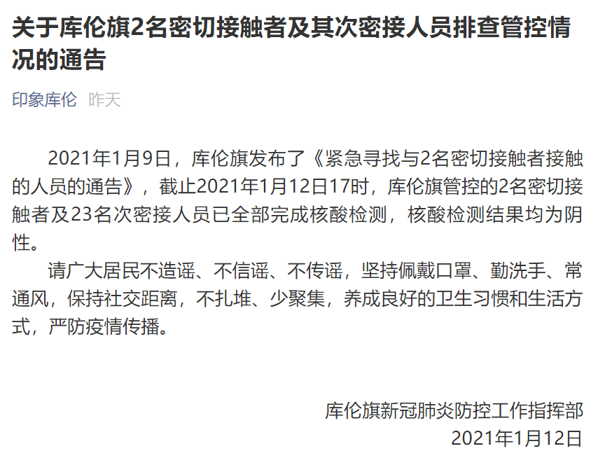 据“印象库伦”微信公众号消息,2021年1月9日,库伦旗发布了《紧急寻找与2名密切接触者接触的人员的通告》,截止2021年1月12日17时,库伦旗管控的2名密切接触者及23名次密接人员已全部完成核酸检测,核酸检测结果均为阴性。