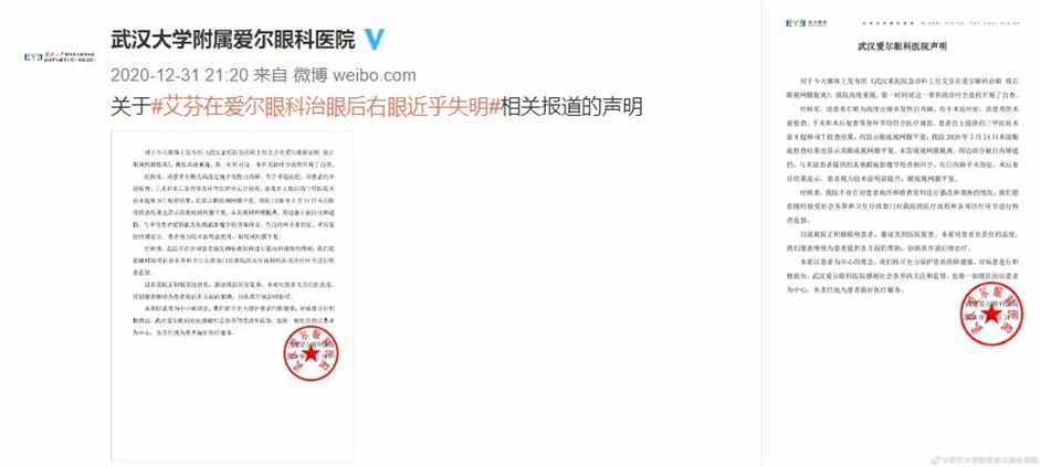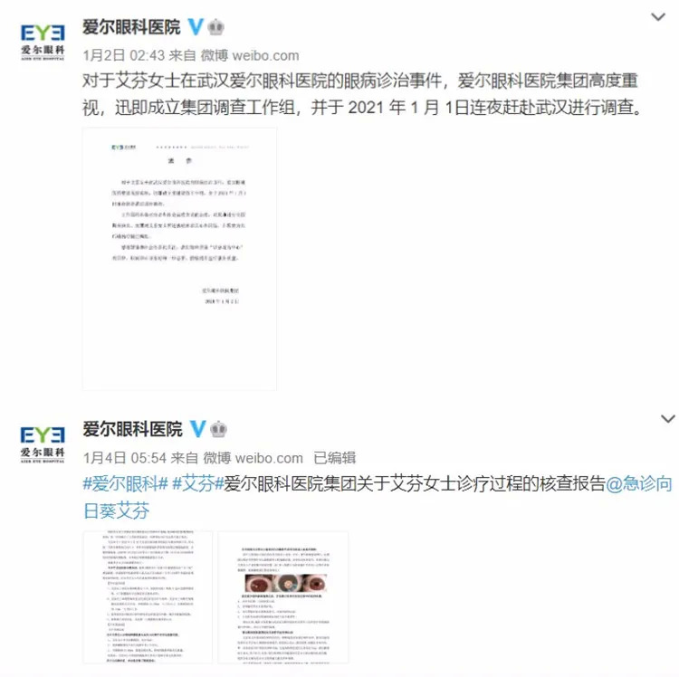 当天晚上,该医院在微博上发布否认声明称各环节符合医疗规范。2021年1月2日凌晨2:43,爱尔眼科集团发布声明称高度重视该事件,成立集团调查工作组,并于1月1日连夜赶赴武汉进行调查。