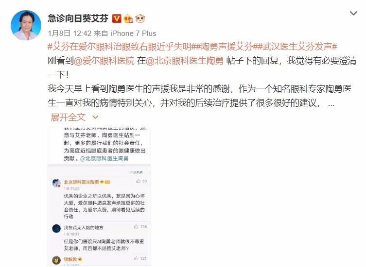 1月8日,知名眼科医生陶勇就抗疫医生艾芬和爱尔眼科医疗纠纷事件发声,称决定和艾芬老师一起,为减少视网膜脱落患者努力,希望成立“爱眼底”公益项目。