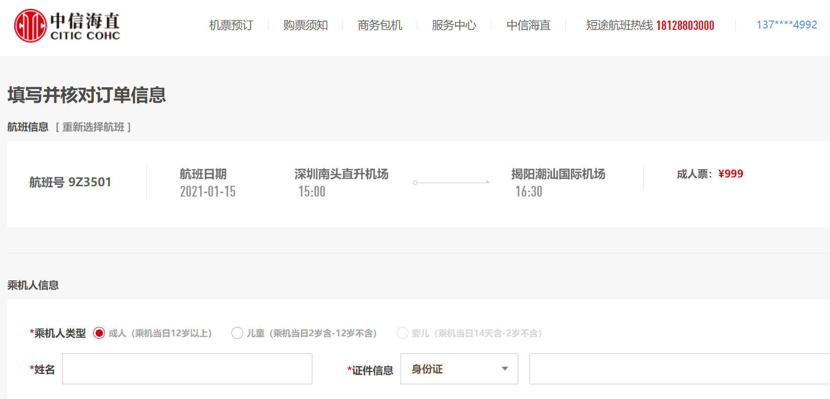 虽然中信海直宣布开通了深圳-潮汕、深圳-珠海两条航线,但在实际订票时,出发和到达城市只有深圳、潮汕两个可以选择,珠海不在可选择的城市行列。