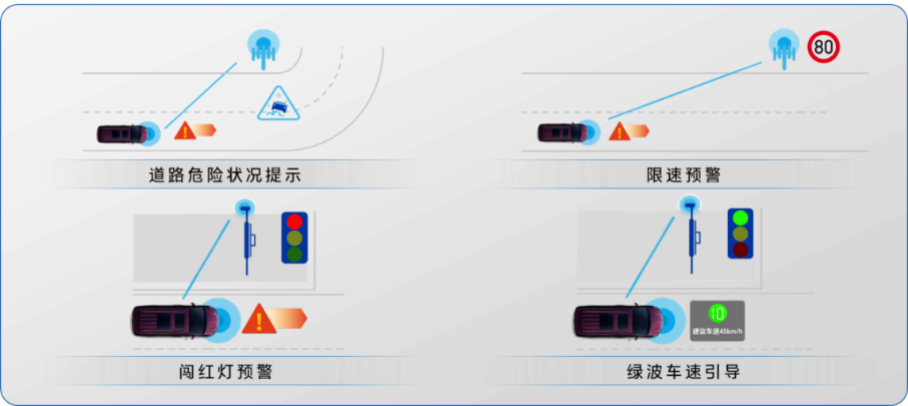 V2I是车辆与路边单元 RSU(Road Side Unit )间通信,这些设施包括但不限于红绿灯、摄像头、黄线等。这些交换可以获得道路危险状况提示、闯红灯预警、限速预警和绿波车速建议。